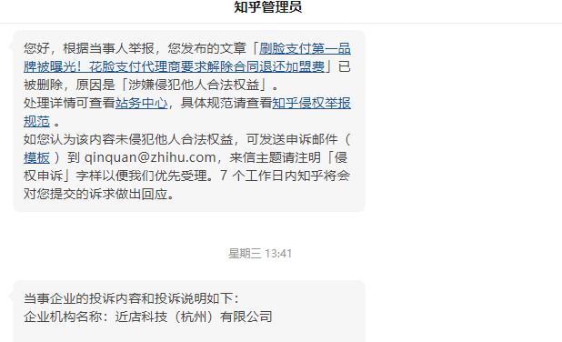3月25日,笔者受到一封来自“知乎管理员”侵权的私信:您好,根据当事人举报,您发布的文章「刷脸支付第一品牌被曝光!花脸支付代理商要求解除合同退还加盟费」已被删除,原因是「涉嫌侵犯他人合法权益」。 处理详情可查看站务中心,具体规范请查看知乎侵权举报规范。 如您认为该内容未侵犯他人合法权益,可发送申诉邮件(模板 )到 qinquan@zhihu.com,来信主题请注明「侵权申诉」字样以便我们优先受理。7 个工作日内知乎将会对您提交的诉求做出回应。