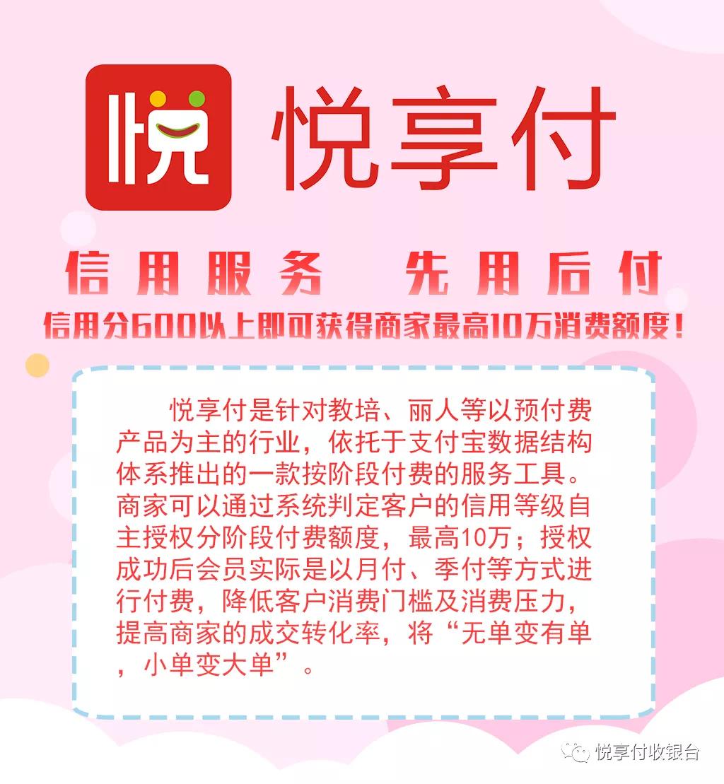 网友评价:悦享付是针对教培、丽人等以预付费产品为主的行业,依托于支付宝数据结构体系推出的一款按阶段付费的服务工具。商家可以通过系统判定客户的信用等级自主授权分阶段付费额度,最高10万;授权成功后会员实际是以月付、季付等方式进行付费,降低客户消费门槛及消费压力,提高商家的成交转化率,将“无单变有单,小单变大单”。