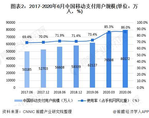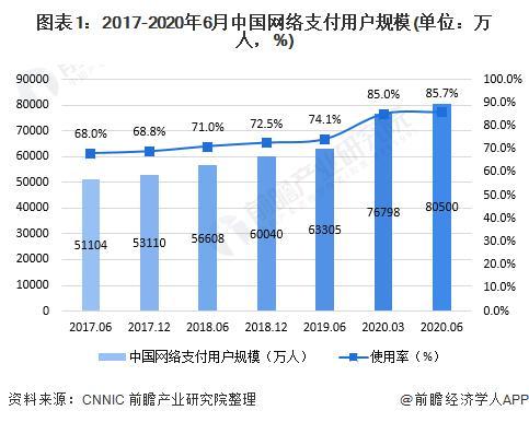根据 CNNIC 于 2020 年 9 月 29 日发布的第 46 次《中国互联网络发展状况统计报告》,截至 2020 年 6 月,我国网络支付用户规模达 8.05 亿,较 2020 年 3 月增长 3702 万,占网民整体的 85.7%; 我国移动支付用户规模达 8.02 亿人,较 2020 年 3 月增长 3664 万,占手机网民的 86.0%。