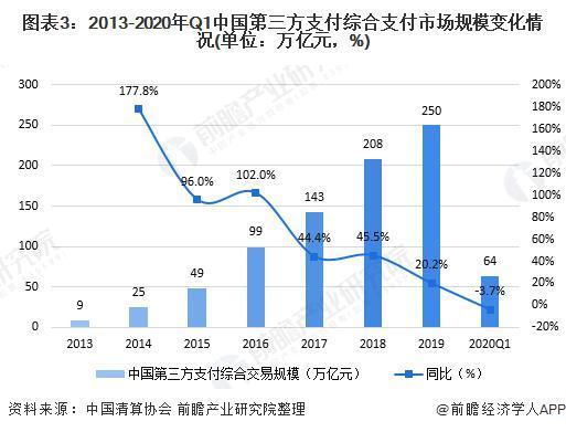 2020 年一季度,由于疫情影响,线下消费类交易规模大幅减少,第三方支付综合支付市场交易规模仅为 64 万亿元,同比下降 3.7%。