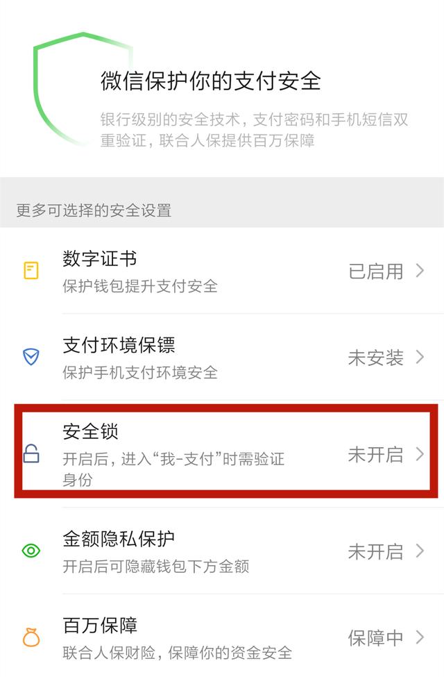 微信中有安全锁可以设置,打开微信点击支付然后再点击钱包,在最后面有个“安全保障”。点击之后就会出现一直保护着你支付安全的几个选项。安全锁就是以后支付时需要的密码验证,开启就可以了。