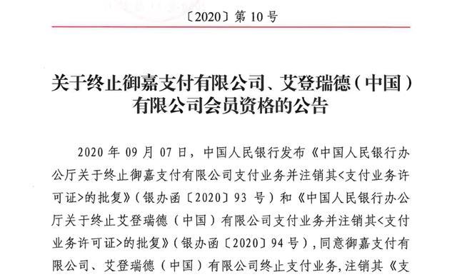 支付曝光台(ZFBGT.COM)讯:近日,央行发布关于终止御嘉支付有限公司、艾登瑞德(中国)有限公司会员格的公告,同意御嘉支付有限公司、艾登瑞德(中国)有限公司终止支付业务,注销支付业务许可证。