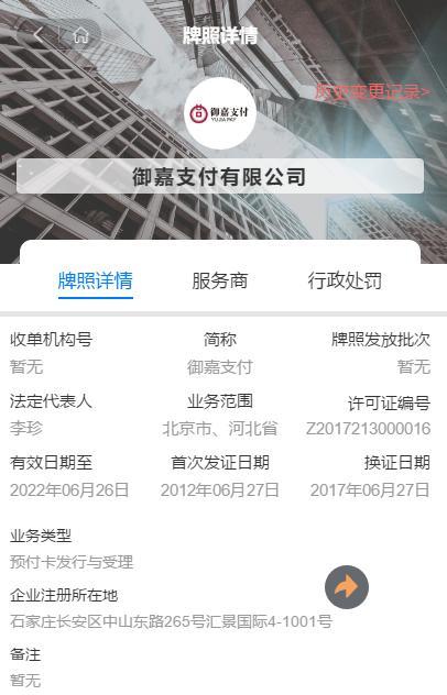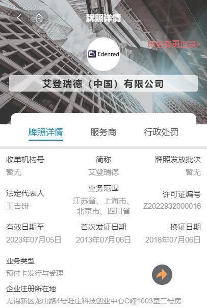 上述两家公司的牌照业务范围为预付卡发行与受理,艾登瑞德业务范围为江苏省、上海市、北京市、四川省,御嘉支付有限公司的业务覆盖范围为 北京市、河北省。