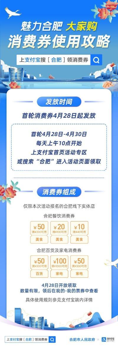 活动开始后,公众可通过点击支付宝APP首页专区入口或在支付宝搜索“合肥”进入“魅力合肥·大家购”活动页面领取消费券,领取后,消费券将发放至消费者支付宝卡包。