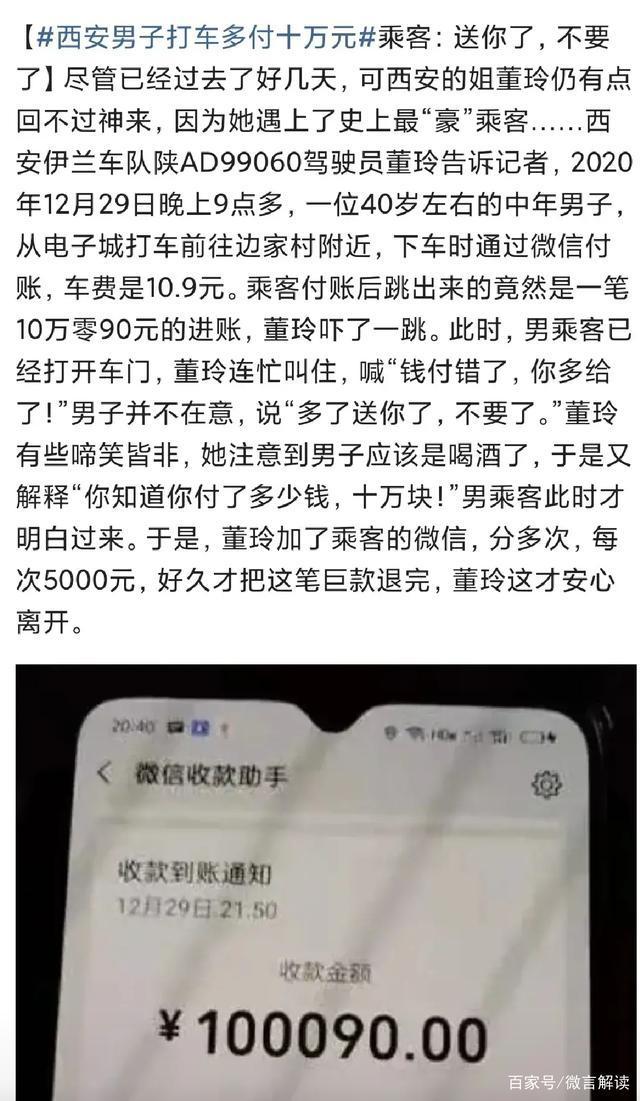 12月29日,西安跑出租车的董姐搭载了一名醉酒男子,男乘客误将10.9元车费支付为100090元。董姐发现后赶紧告知对方支付多了,对方却说多支付部分送给董姐了,董姐告知对方多支付了10万元,对方才反应过来,最终董姐将多余钱款退还了对方。