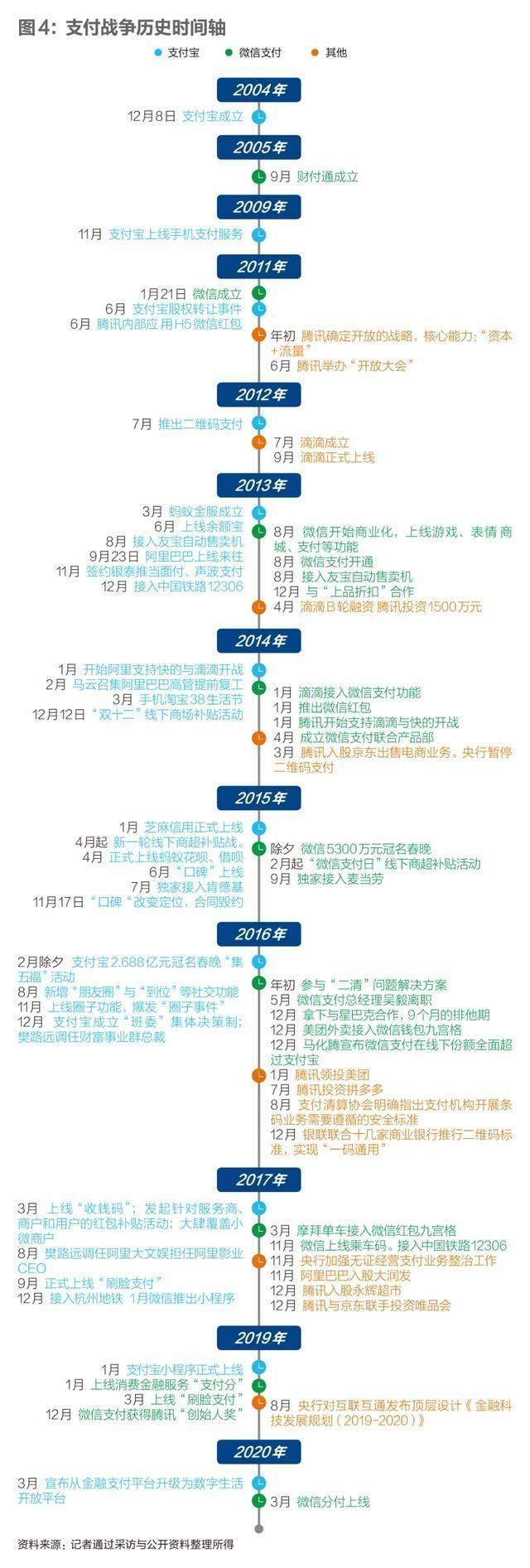 如果纵览时间线,这场支付战争由2013年微信支付的诞生开始,到2016年底格局初定,再到2019年战场上双方火力终于减弱。这场商业战争曾经声势浩大,无论是当年滴滴、快的的网约车之战,还是摩拜、ofo的单车之战,背后都在发生支付战争。