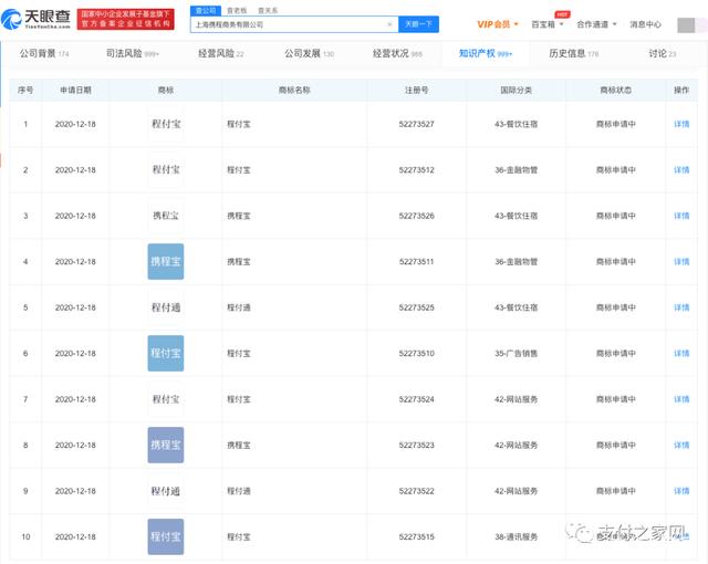 近日,上海携程商务有限公司新增多条支付类商标注册信息,名称分别为“程付通”、“程付宝”、“携程宝”,类别涉及金融物管、餐饮住宿、网站服务、运输贮藏等。目前商标状态均为:商标申请中。