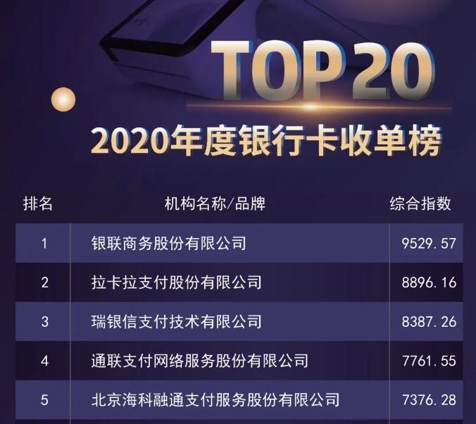 在支付百科稍后公布的2020年度银行卡收单榜TOP20中,瑞银信支付技术有限公司以综合指数8387.26的成绩跻身前三位,保持了行业头部机构的传统优势。