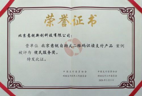 近日,中国支付清算协会网络支付应用工作委员会和移动支付工作委员会公布了2019年度优秀产品与服务案例评选结果,意锐凭借“自助式二维码识读支付产品”与工商银行、中国银行、建设银行、中国银联等一并获得“便民服务奖”,成为获得该奖项的5家企业之一。