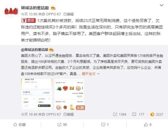 微博网友@做减法的葱姑娘在美团上有一笔305.95元的欠款,本应该在10月8日偿还,已经逾期了90天,利息10.12元。后续该用户在微博上质疑:“1次莫名其妙被贷款,后续23次正常无限制消费,这个债务厉害了,欠账违约还能继续买2个多月的菜!”