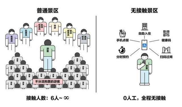 据悉,在传统景区,游客游览需要历经购票、验票、测量体温、导游、点餐、酒店入住等,至少有6个环节需要人工服务,但在无接触景区,这些环节大多在线上完成,可以有效避免不必要的人员接触。