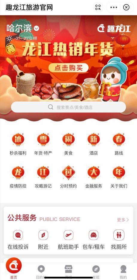 同样在黑龙江,只要在支付宝搜索“趣龙江”,即可在线分时预约景区,还可以查询住宿、机票、特产等信息。
