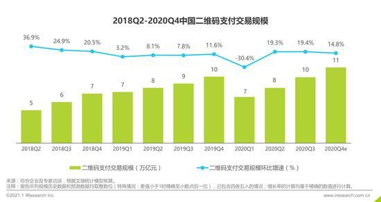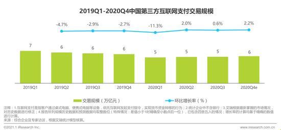 2020Q3中国第三方互联网支付交易规模约为5万亿元,环比2020Q2交易规模增长0.6%,受P2P在本季度全部关停的影响,第三方互联网支付环比增速有所放缓。