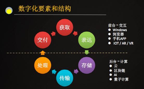 数字化结构分为前台和后台两部分。前台用于信息的获取、交互。前台已经历经了PC时代Windows、互联网时代的浏览器、移动互联网时代的手机APP、再到5G万物互联的IOT/AR/VR。后台用于信息的处理和计算方式,从服务器到云、区块链、人工智能、量子计算进行了多维度的扩充。