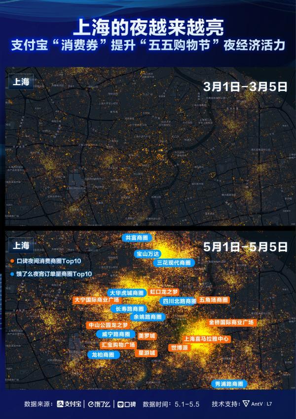 口碑数据显示,世博源、中山公园龙之梦、大宁国际商业广场、汇宝购物广场、星游城、美罗城、虹口龙之梦、五角场商圈、金桥国际商业广场、上海喜马拉雅中心等10个商圈在晚上8点之后的营业额增速最快。从中小商户到百货商场,纷纷选择数字化“消费券”促进线下消费的模式,世博源商圈代表着一大批商户在五五购物节提升了“在线新经济”的能力,让上海的夜散发出新活力。国家开发银行上海金融研究发展中心资深研究员纪飞峰表示,五五购物节展现了新消费力量,更是描绘了一个在线新经济深度支撑城市发展的“上海样本”。