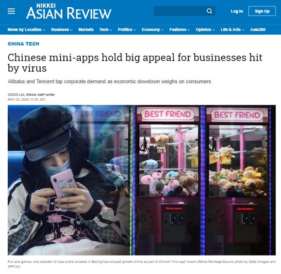 近日,日经发表了一篇题为《小程序助力中国企业复工复产》的报道,从一位抓娃娃机老板借助支付宝小程序在疫情期间转危为机入手,以小见大,肯定了小程序在疫情期间助力企业实现数字化转型,复工复产的积极作用。