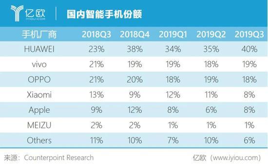 此前国外数据网站Counterpoint Research的数据显示,华为在国内手机市场份额占比上有着绝对的领先地位,2019 Q1为34%、2019 Q2为35%、2019 Q3为40%,2019年第三季度华为的市场份额占比已多于vivo、OPPO之和。