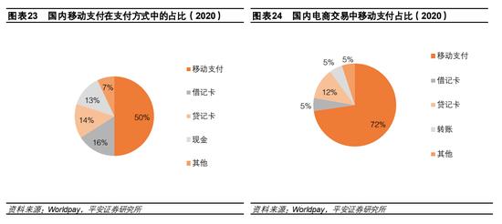 互联网支付方面,根据易观的数据统计,2019年支付宝、财付通的市场份额分别为 28.5%/12.2%,分别位列第 1、第 3位。虽然支付宝、财付通在内的第三方支付平台在互联网支付方面并没有达到移动支付的市占率水平,但考虑到近几年移动支付快速发展,在整个支付市场中占比远高于其他支付方式,根据 WORLDPAY 发布的《2021全球支付报告》数据显示,移动支付的占比达到 50%,因此综合来看,支付宝、财付通两个巨头在整个支付市场占据了领先的份额。