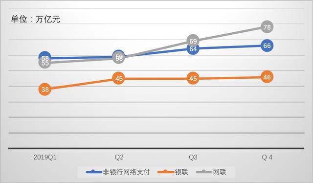 先阐释我们的分析思路:以央行支付结算司数据为基础,对比“非银行网络支付”(统计口径不包括支付账户余额充值,红包等娱乐性支付行为,但包括余额支付)和网联(包含充值、红包以及经由银行快捷支付的第三方线上移动支付行为,不包括余额支付),和银联数据(银行卡支付和经由银行快捷支付的第三方线下移动支付行为),对2019年的第三方支付走向做出大致判断。