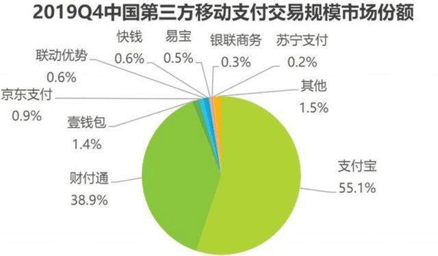 96000亿!支付宝稳居第一,微信紧随其后。近日,根据第三方机构艾瑞,发布的2019年Q4季度移动支付交易规模的数据报告来看,支付宝再次稳居第一,而且是连续三个季度实现增长,而且支付宝的市场份额高达55.1%,而微信紧随其后拿下第二,腾讯财付通(微信支付)的市场份额则是38.9%,可以看到在移动支付领域,微信和支付宝占据了94%的份额,基本上处于垄断地位,后续的企业想分一杯羹太困难了。