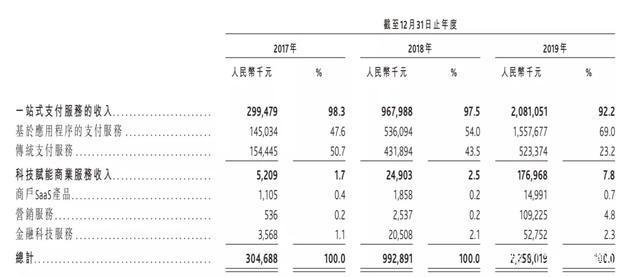 2017年至2019年,移卡的营业收入分别为3.04亿元、9.02亿元和22.58亿元,复合年增长率为172.2%。其中,支付服务为最主要的收入来源,在2017年至2019年的收入占比分别为98.3%、97.5%和92.2%。