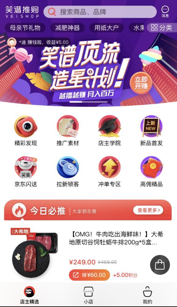 值得一提的是,笑谱产品足够包容,能把电商能力赋予每一个想从事带货、加入电商行业的人。在笑谱模式里,由平台负责选择货源、代发商品、提供售后服务、制作营销素材,地推人员、商户、消费者都可以一键注册成为店主,通过图文、视频等方式分享来获取最终成交的销售收益。