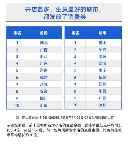从区域分布来看:湖北、广西、浙江、广东、河南等省每周新增个体户小店数量在全国名列前茅;佛山、绍兴、温州、武汉、南宁则成为名列前茅的城市。结合新增个体户小店周均交易额来看,他们不仅实现了就业,而且生意还不错:4月以来与疫情中最低谷的2月1日那一周相比,其中5个城市每周新开小店的流水平均增幅达到10倍以上,深圳更达惊人的20倍,这反映了复工复产的进度显著加快。