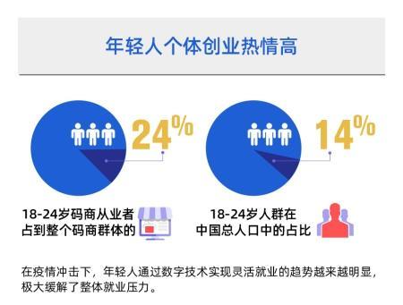 从新增个体户的年龄分布来看,2019年支付宝上18-24岁从业者占比24%,远超这一人群在总人口中约11%的占比。这说明在疫情冲击下,年轻人通过数字技术实现灵活就业的趋势越来越明显。