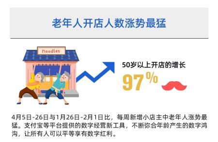 更值得注意的是中老年人。2月以来的数据显示,50岁以上人群的新增个体户就业涨势最猛,尤其是4月以来对比最低点2月1日当周,这一人群每周新开店数量提高了97%。郭峰认为,这证明数字技术在不断下探,挖掘新人群潜力。