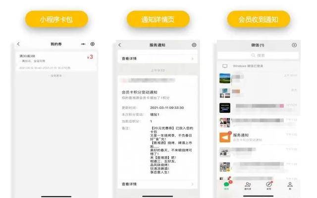 4、微信服务通知打破支付壁垒,系统能以官方服务通知的形式把活动通知直接推送到会员的微信首页,同时把优惠券放入会员的小程序卡包。
