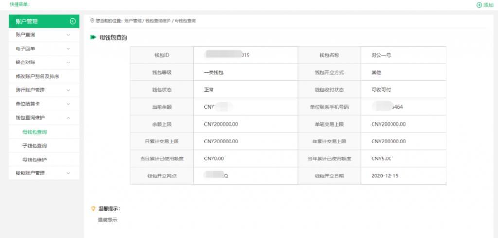 数字人民币对公钱包是企业(商户)数字人民币收款的载体,是依托法定数字人民币流通体系的支付工具,用于数字人民币收付、母子钱包维护、资金交易查询及红包批量代发等业务处理。