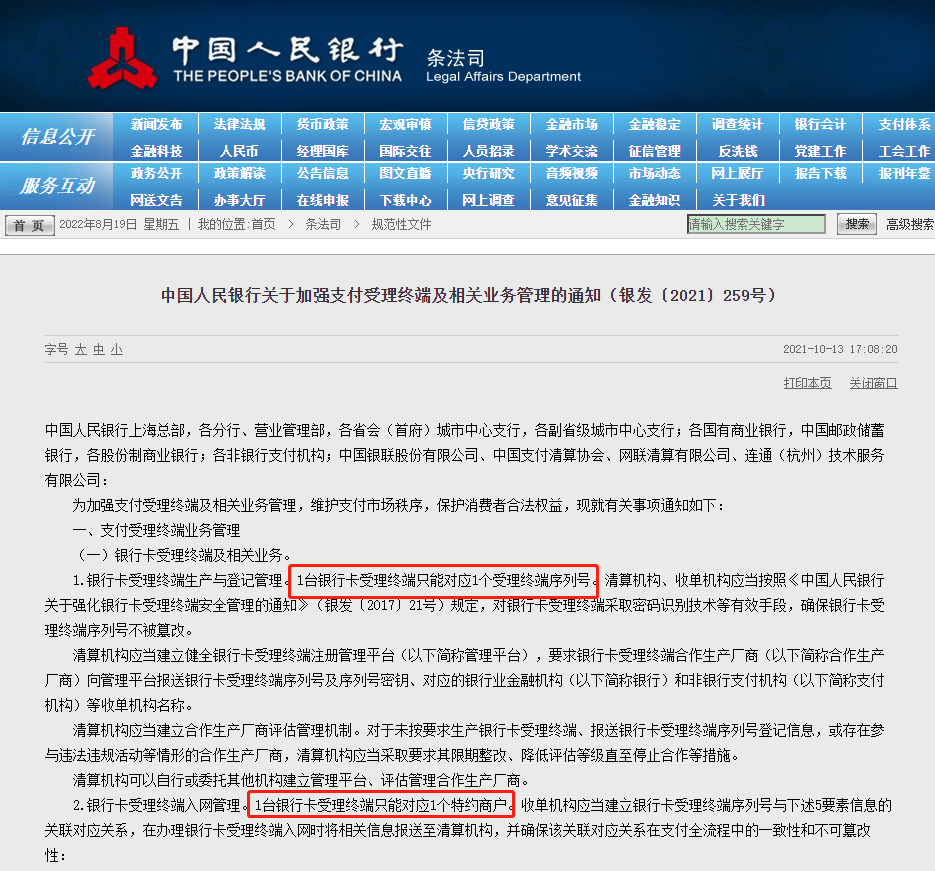 2021年10月13日,中国人民银行发布《关于加强支付受理终端及相关业务管理的通知(银发〔2021〕259号)》(以下简称“259号文”),其中明确规定“1台银行卡受理终端只能对应1个受理终端序列号”“1台银行卡受理终端只能对应1个特约商户”,通过“跳码”获取差额收益这条路被堵死,支付机构靠跳码躺赚的好日子可能将会一去不复返。此外支付机构还需要根据人行要求对不符合规定的银行卡受理终端限期内进行改造或更换,机具成本大幅增加,涨费率成了稳营收的必然选择。