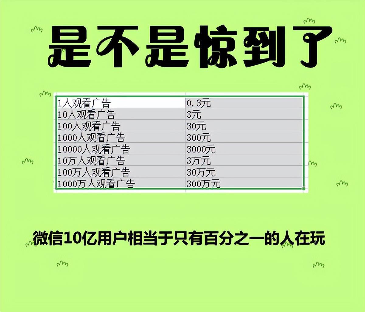得出的结论吓不吓人。微信10亿用户,只有百分之一的人在玩这个游戏,如果全玩你想想。一天收入多少,全微信用户玩的法。一天是3个亿可以赚。这个钱也不是微信出的。是流量主(广告投放商出的,有很多广告商。所以你每次看到的广告也不一样) 像小游戏这种赚钱方式实际上已经不足为奇了。几乎所有的小游戏都是这种赚钱的模式。只是这个羊了个羊生逢吉时。