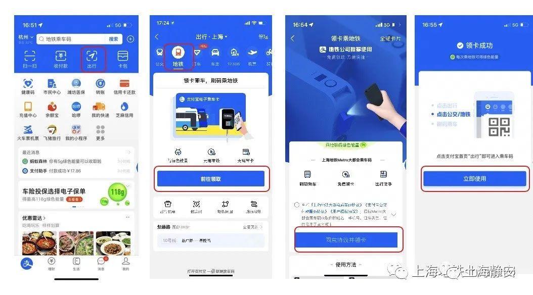 乘客可在支付宝中点击出行切换至地铁,完成领卡、用户注册流程后即可生成地铁二维码(详见下图)