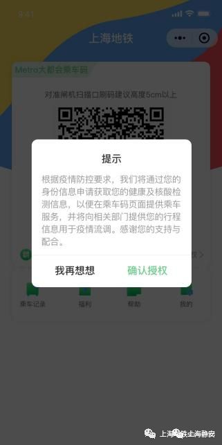 (2)上海地铁“Metro大都会”乘车码授权健康信息