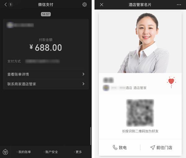 顾客在酒店完成微信支付后,酒店服务人员即可通过支付凭证中的“管家名片”,继续服务用户,满足更多个性化需求。