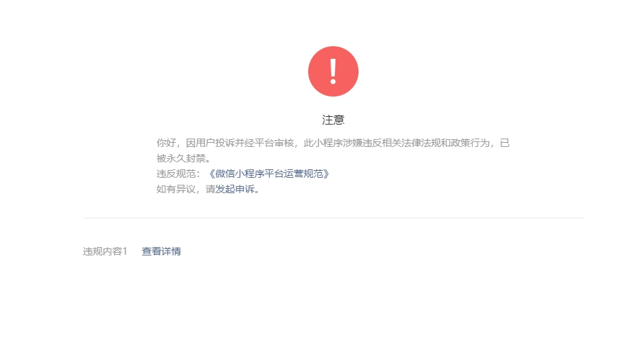 几天后,更要命的事情来了。我的小程序被封。所有的数据都看不见了。连代理的数据也看不见了。因为根本打不开小程序了。