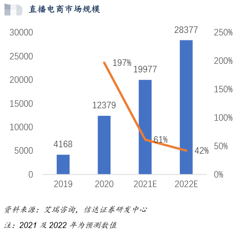 另外,今年3月,信达证券在研报中测算,2021年中国直播电商市场规模将近2万亿元,并预计2022年全年中国直播电商市场规模达到2.84万亿元,同比增速大幅放缓,从2020年的197%降至42%。