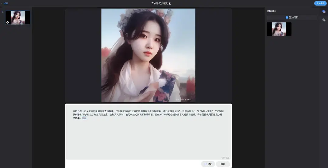 目前出门问问数字人平台【奇妙元】已经上线了照片驱动功能,几分钟就可以快速制作数字人视频。