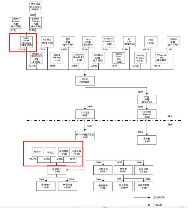 据招股书,公司创始人刘颖麒持有移卡科技52.43%股份;腾讯也是移卡的股东,腾讯通过海外注册的子公司THL U持股3.93%;机构投资者IVP基金持股7.77%。