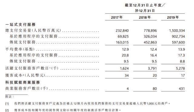 但令人诧异的是,业务规模爆量,移卡披露的获客成本是在下降的,据其招股书称,借助于强大的分销网络和市场推广渠道,2019年末,每名用户获客成本为17元,而在2017年这一数值是34元;超过90%的商业服务用户从支付服务客户中转化而来。