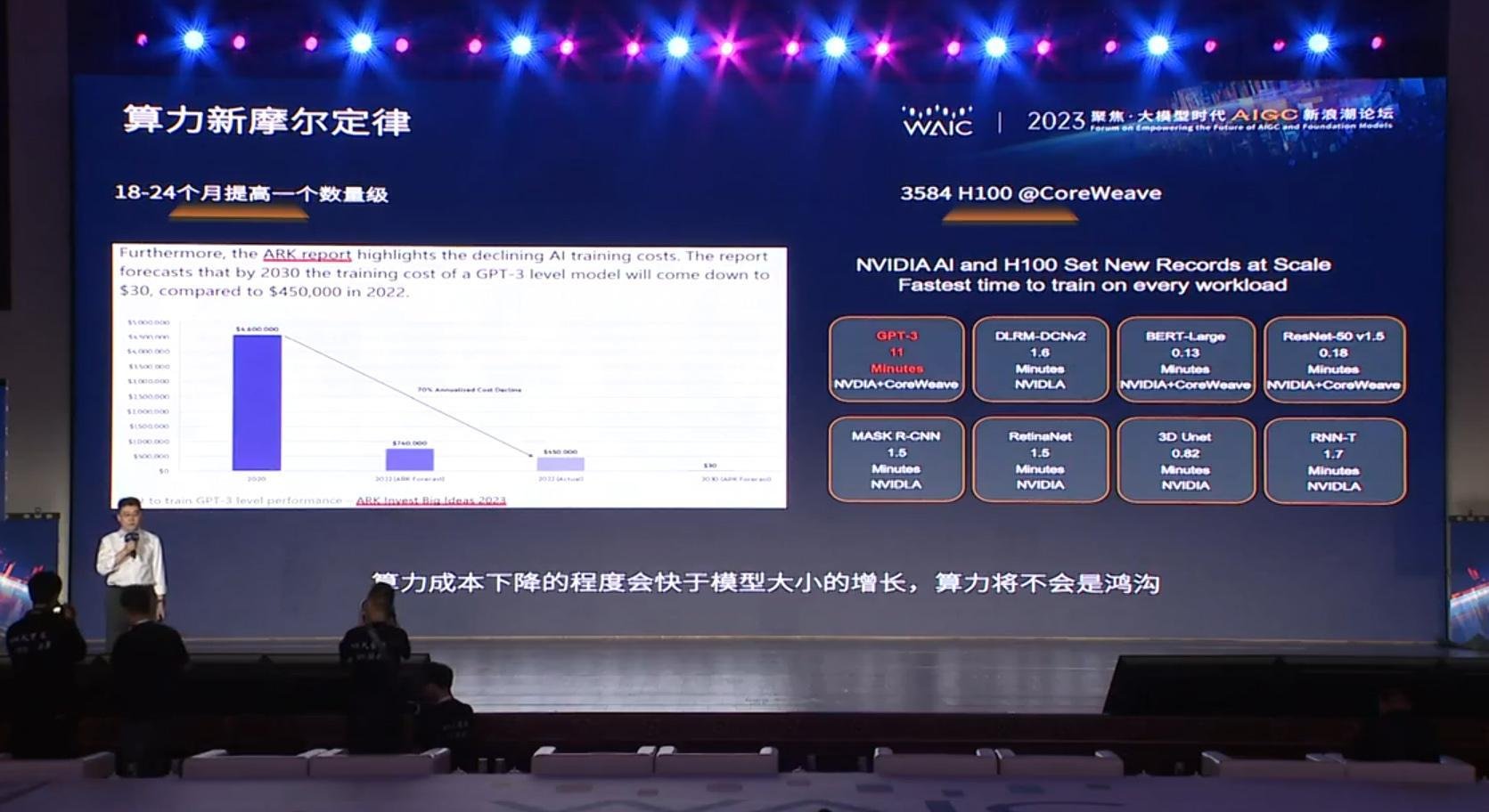 尚明栋提到,美国初创公司CoreWeave在最近使用3584张H100芯片,仅用时11分钟就完成GPT-3模型的训练,整体开销约2万美元。但在2020年训练GPT-3模型需要450万美元,在2022年依然需要45万美元。“我们看到,随着算力和并行的一些基础软件的演进,我们算力的成本在持续下降。而算力成本下降的速度,我们判断也会快于模型大小增长。所以,以后算力将不会构成大模型计算的一个鸿沟。”