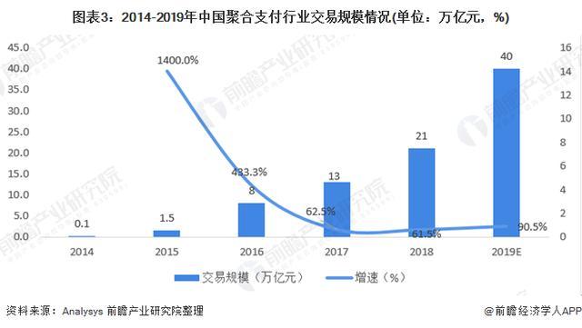 我国聚合支付行业交易规模总体呈逐年增长态势,年均复合增速高达231%,2019年行业交易规模近40万亿元