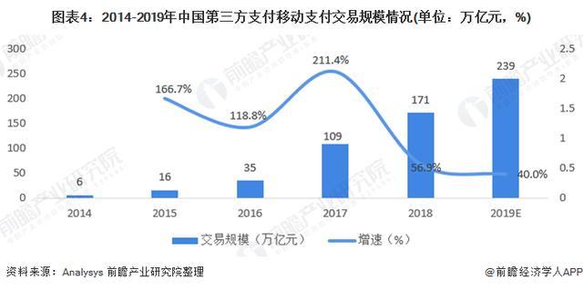 2014-2018年我国第三方移动支付交易规模总体呈逐年增长态势,年均复合增速高达95%。随着我国便捷支付的不断发展,初步估计2019年我国第三方支付移动支付交易规模近239万亿元。