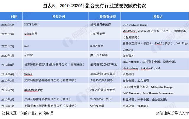 据IT桔子数据,2019年聚合支付行业投融资事件为5起,投融资金额达3.23亿元。截至2020年5月行业投融资事件为4起,投融资金额达1.53亿元。具体投融资事件详见下表: