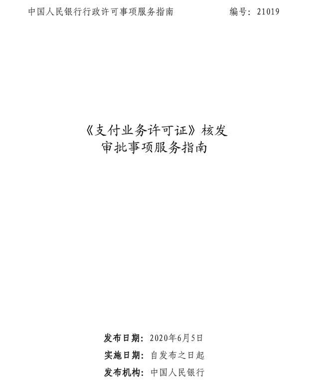 《支付业务许可证》核发审批事项服务指南自发布之日(2020年6月5日)起实施。