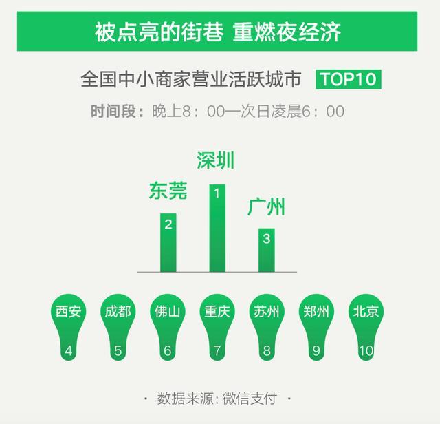 随着各地居民消费潜力被激活,丰富多彩的城市夜生活也回来了。最近趋势显示,夜经济的活跃度仍在提升,深圳、东莞、广州三地是全国小商家营业最活跃的城市,西安、成都、佛山等地位列其后,晚八点到凌晨六点成为中小商家最活跃的营业时段。