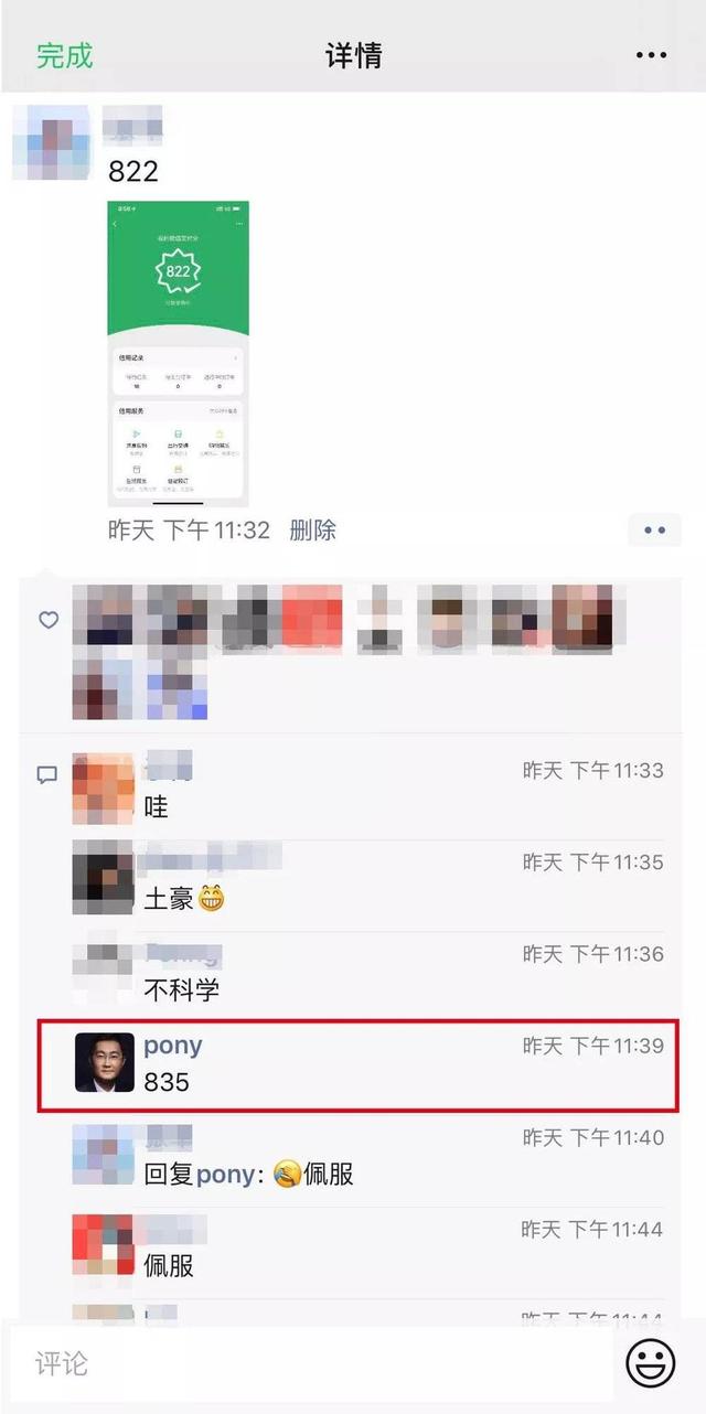 近日,腾讯公关总监张军在朋友圈晒出自己的支付分,引来腾讯CEO马化腾在评论处的炫耀——835分。凭借这一不俗的分数,“小马哥在朋友圈里四处挑战。”