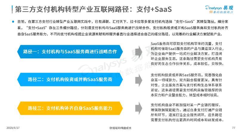易观报告中也指出,第三方支付机构转型产业互联网的路径是支付加SaaS,不同的支付机构根据企业资源禀赋和服务垂直行业选择细分路径,以完善行业解决方案赋能产业。
