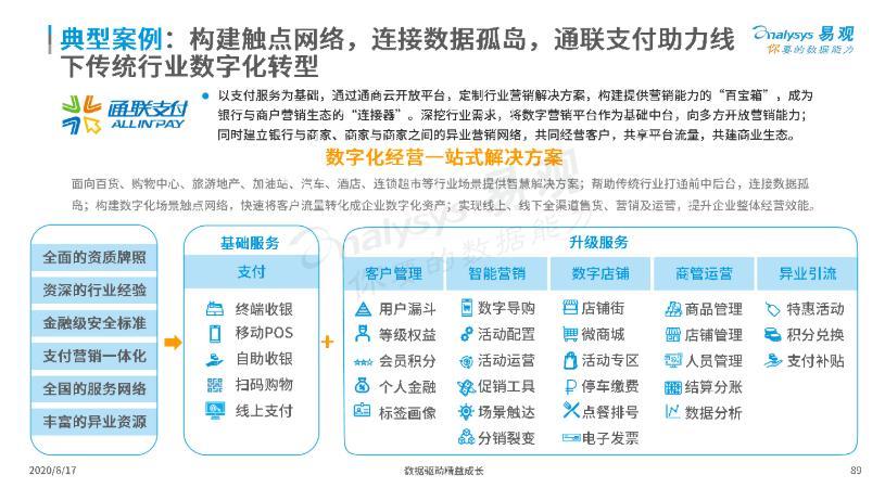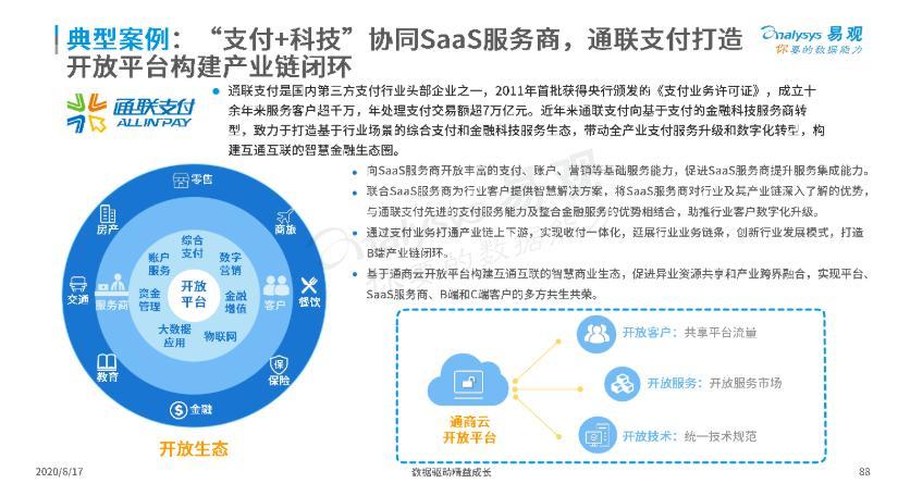 报告指出,通联支付等头部支付机构聚焦金融科技升级与服务业数字化,基于资源、场景、数据、技术等优势,以“支付+SaaS”的路径大力布局支付产业互联网,从支付服务商向综合数字化服务商转型。